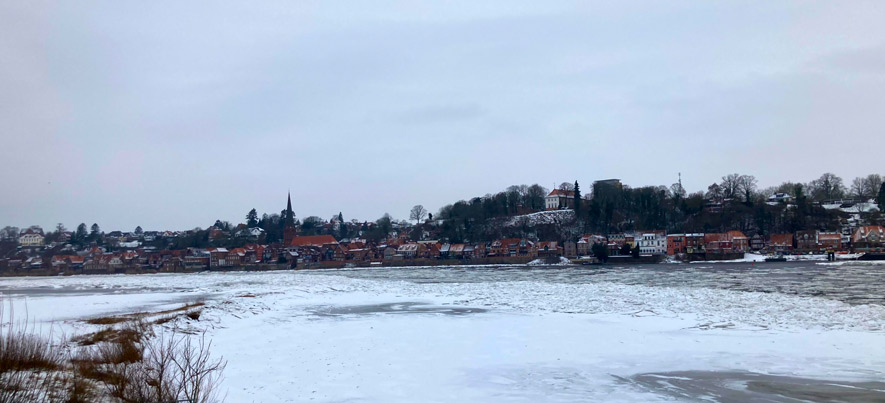 Nach dem Motto: „Warum bis Neunzig warten“ hat uns meine Mama ins Hotel Bergström (Bekannt aus „Rote Rosen“) eingeladen – und wir waren wirklich alle da, mit Bulli und Tiguan (weil ein großes Auto nicht mehr reicht). Essen gab es in der Gaststätte gegenüber (rustikal und gemütlich) Übernachtung und großes Frühstück im Hotel. Das war sehr schön, hat allen gefallen. Natürlich war es auch in Norddeutschland eisig, an der Elbe gab es einen Menschenauflauf wegen der Eisschollen, die sich vor Geesthacht zu Bergen auftürmten. Vor Hohnstorf war es noch nicht ganz so spektakulär: