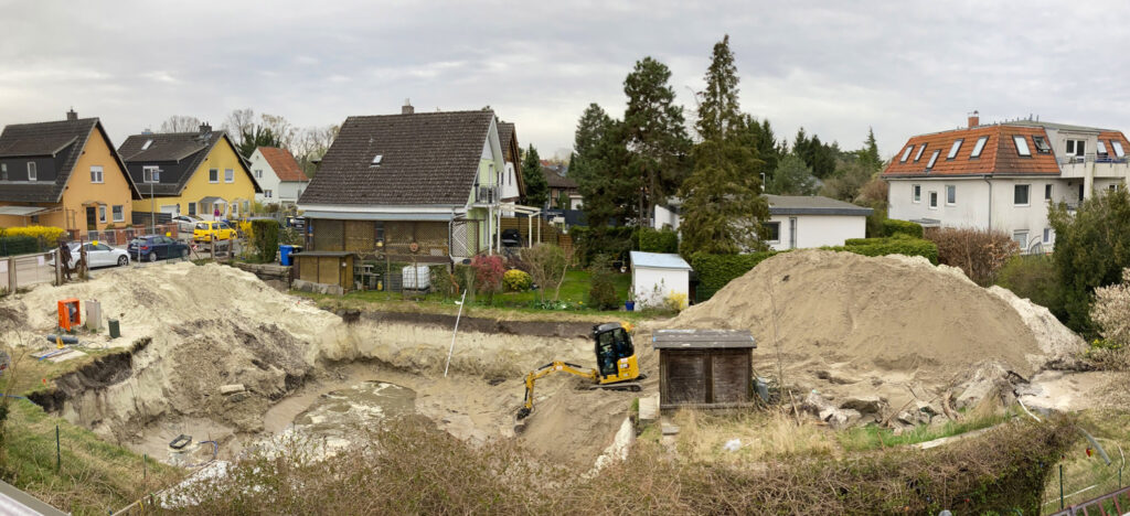 Auch die große Baustelle nebenan war wieder in Bewegung. Nachdem schon Ende Februar ein großer Bagger mächtig zugeschlagen hatte, dröhnte jetzt tagelang ein kleinerer genauso laut vor sich hin und bewegte Sand aus der Grube.
