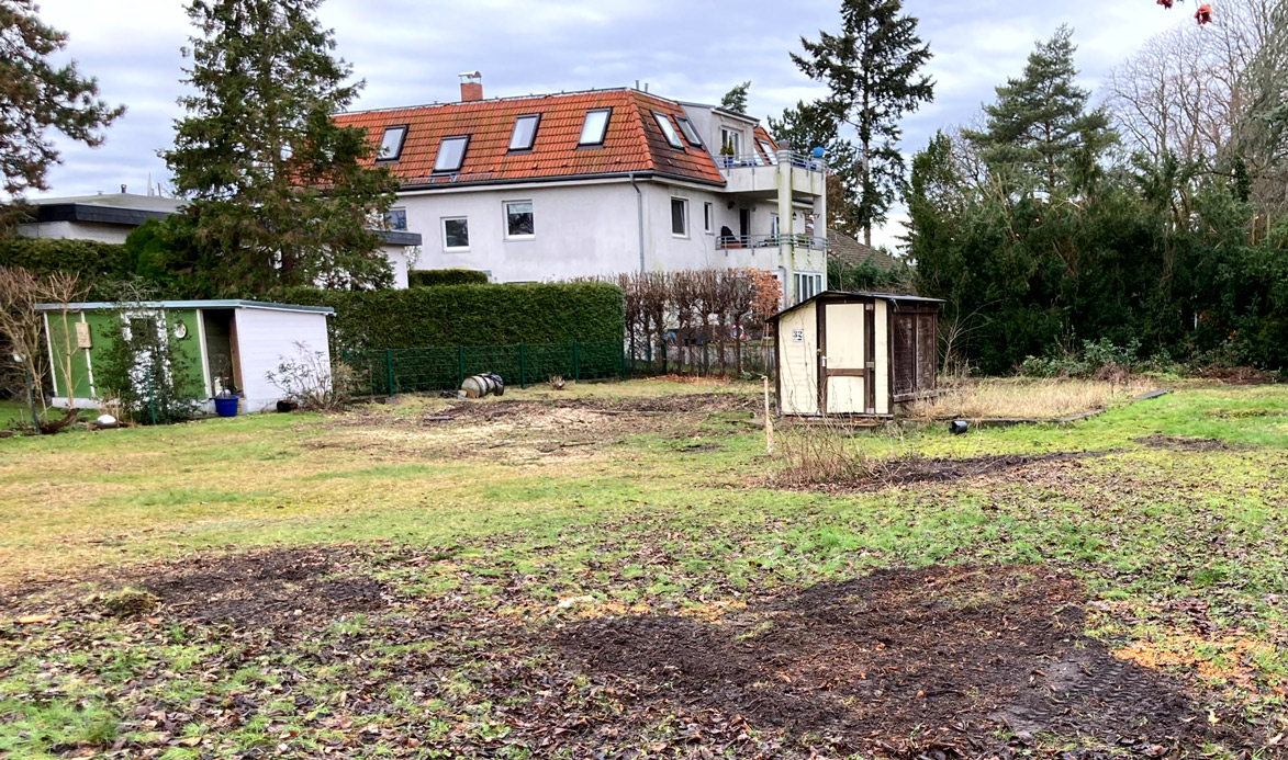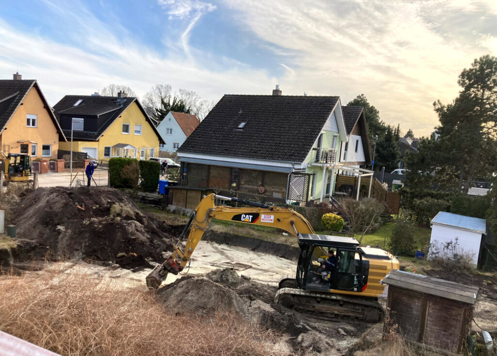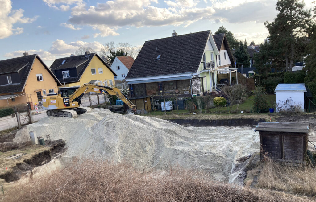 … fällt mir doch immer wieder der Grönemeier ein, wenn ich unsere Baustellen so höre. Nun geht es dann los, hier nebenan. So wie vor einem Jahr völlig unvermittelt die Baumfrevler anrückten, wurde Ende Februar 26 – das Knie war gerade zugenäht – ein großer Bagger angefahren und erst mal der gute Boden weggebracht. Jetzt haben wir es nur noch mit feinstem Flussand zu tun.