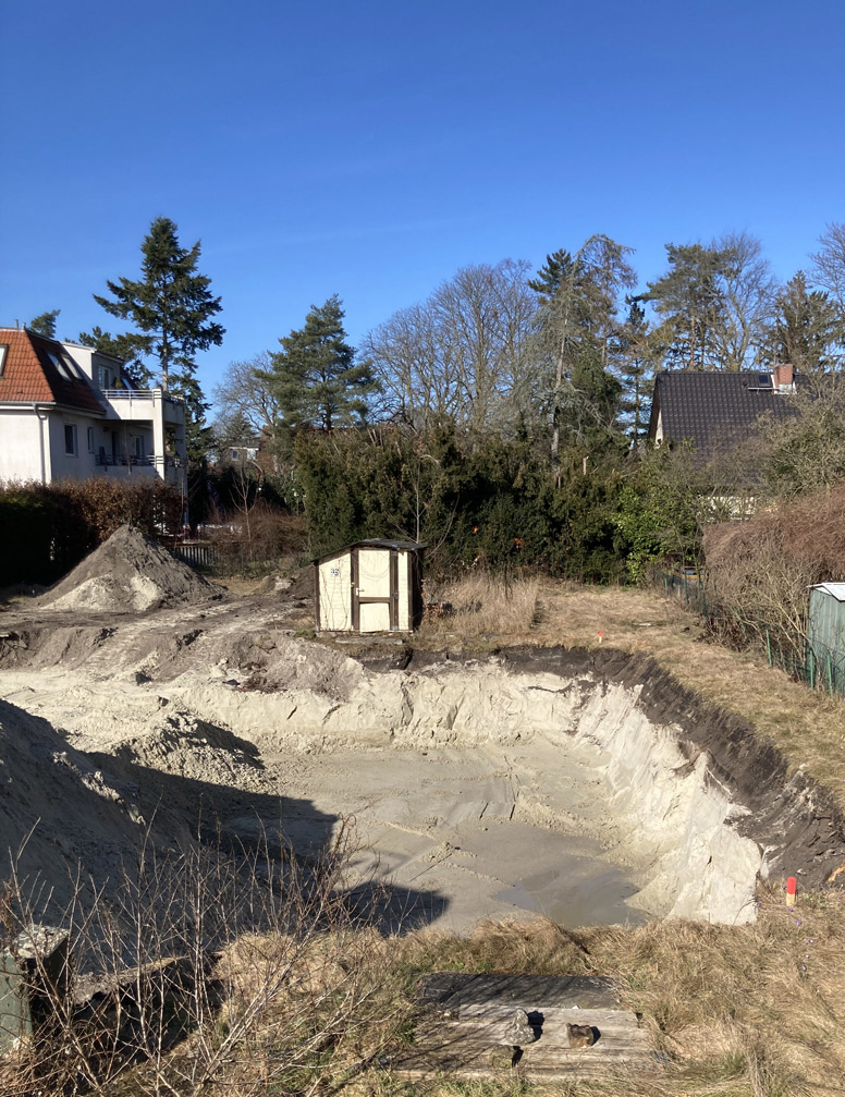 Der Aushub wurde größtenteils erst mit LKW abgefahren, bevor dann später riesige Sandberge hinten aufgehäuft werden sollten. Mancher Schubkarrenbesitzer aus der Gegend kam dann auch gleich vorbei – für Mutterboden oder Buddelsand – hätten wir früher auch gemacht. Ja, nun weiß ja jeder hier (und eigentlich in ganz Berlin), das das Grundwasser im Blumenviertel nicht besonders tief ist. Das Drama mit den nassen Kellern ging durch alle Medien, die ganze Gegend war mit Plakaten zugehängt. Man kann den Grundwasserstand sogar über eine offizielle Stelle einsehen. Demnach lag der GW-Spiegel Mitte Januar 26 bei ca. 33m über nn. Die Bodenkante hier war zu Beginn bei 35,40m.