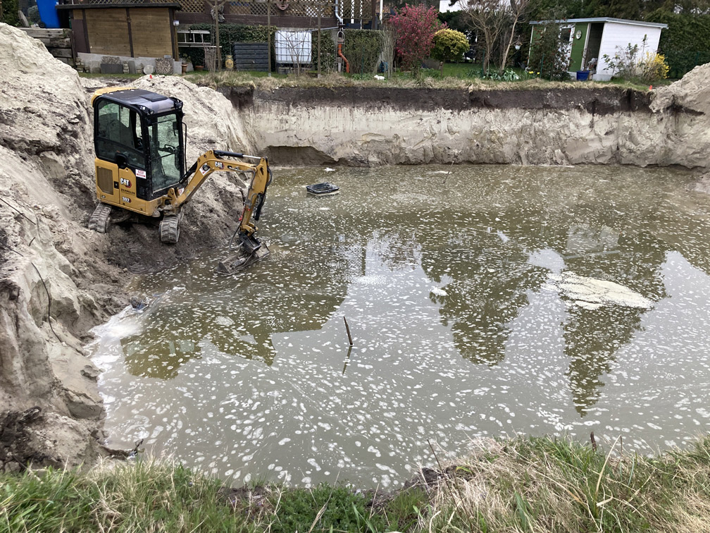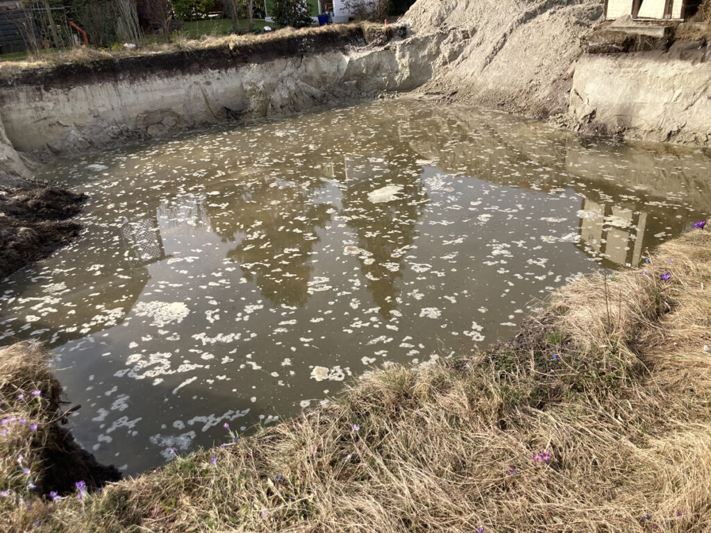 Dann war erst mal eine Weile Pause. Dieses Jahr ist bisher besonders trocken, unser Gartenteich hatte z.B. Anfang April kein Wasser mehr, ich musste komplett neu auffüllen. Die Trockenheit führte dazu, das der Wasserspiegel nebenan um mindestens 20 cm gesunken ist. Die Bauleute wollten die Grube offenbar trockenlegen, indem zwei handelsübliche Pumpen das Wasser ins Gulli oder/und in ein Loch hinter der Baugrube (!!!) pumpten. Dann sollte ein kleiner Bagger das Loch für eine Bodenplatte vorbereiten (die Rede war von „Sauberkeitsschicht“).