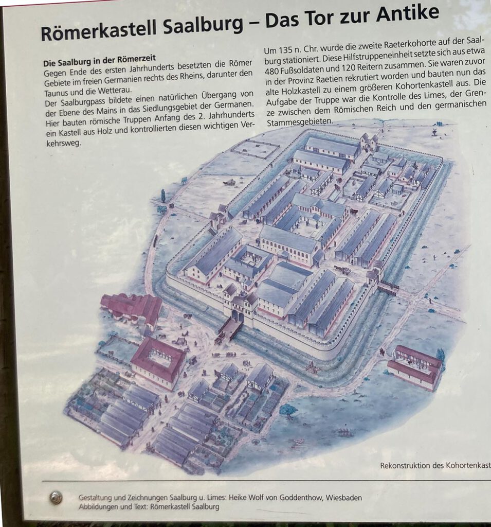 Um die Jahrtausendwende etwa 100 Jahre nach Christi Geburt reichte das römische Reich bis an den Taunus und die Wetterau heran. Die Grenze wurde befestigt durch den Limes und bewacht. Zur Unterbringung der Grenzsoldaten und zur Verpflegung der Tiere wurde ab 135 nach Christus am Handelsweg das Grenzkastell Saalburg zunächst als Holzbau errichtet, später mit Steinbauten befestigt und ausgebaut. Es entstand ein Dorf mit damals moderner Infrastruktur für die Soldaten und Handwerker mit Ihren Familien. Am Handelsweg, nur 2 bis 3 Tagesmärsche von der Provinzhauptstadt Mainz entfernt.